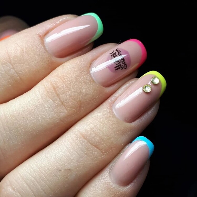 Для любительок яскравого дизайну ми підготували відповідний варіант. Подивіться на фото нижче, на ньому представлений манікюр з використанням кислотних відтінків, і невеликої кількості декору. Такий варіант підійде не тільки для літа, але й для весни.