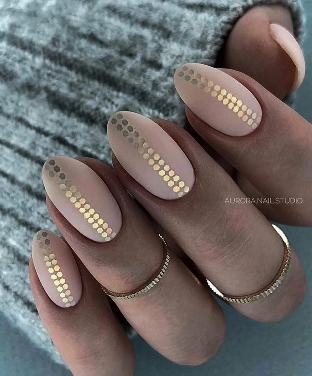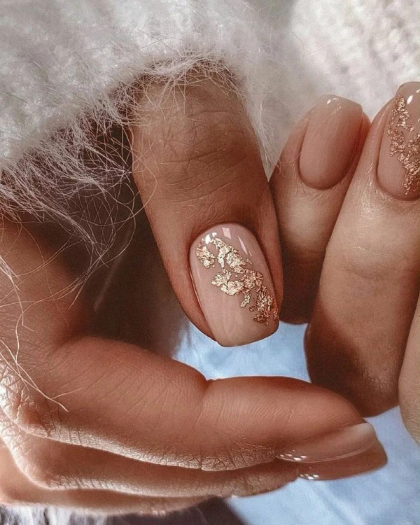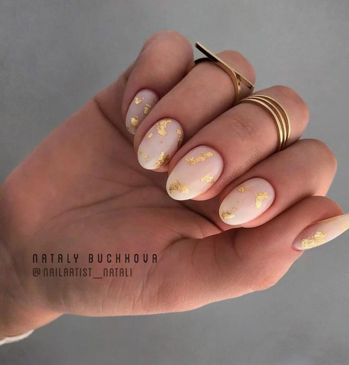 Здавалося б, що фольга та мінімалізм несумісні, але це не так. Майстри пропонують спробувати модний манікюр із відбитками золотої фольги. Важливо, щоб покриття нігтів було ніжним і, навіть, напівпрозорим, а шматочки фольги – невеликими. Такий делікатний манікюр буде ідеальним доповненням вечірнього образу для витончених леді.