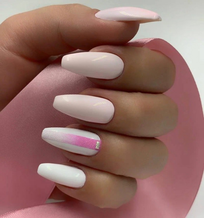 Простота та чіткість ліній нерозривно пов’язані з мінімалістичним манікюром, тому смужки – один з головних трендів даного дизайну. Є кілька способів, як зробити смужки – намалювати за допомогою кисті, використовувати гель “павутинка” або готові блискучі смужки. Також смужки можна викласти з каміфубукі або кристалів – головне, щоб вони виглядали делікатно.