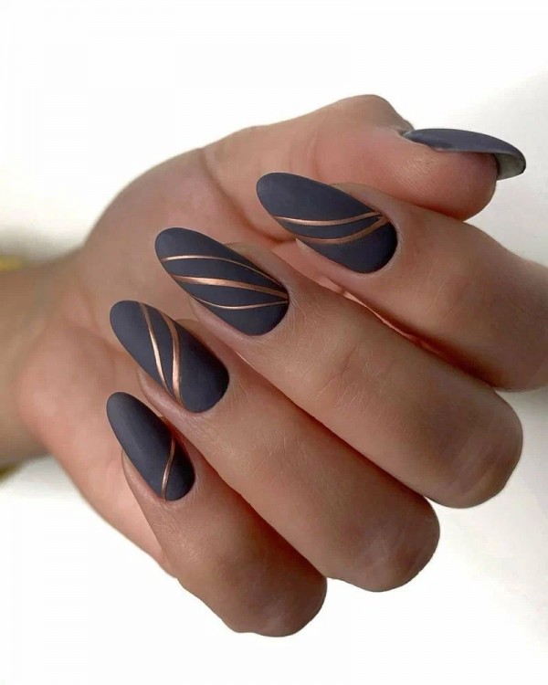 Красивий манікюр на коротких або мигдальних нігтиках можна отримати зі стрічкою, що гнеться, якщо використовувати відразу кілька блискучих смужок, створивши стильний «малюнок» з таких металевих стрічок на одному-двох нігтях. Виглядає такий манікюр дуже ошатно і вишукано.