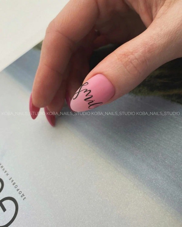 Не втрачають популярності модні написи на нігтях, які краще виконати з використанням готових слайдерів-наклейок, що дуже зручні. Колір фону може бути різним – молочним, бежевим, ніжно-рожевим. Гарно виглядає напис на великому нігті або безіменному, виконаний з матовим або глянсовим топом – у будь-якому мінімалістичному дизайні написи виглядають стильно.