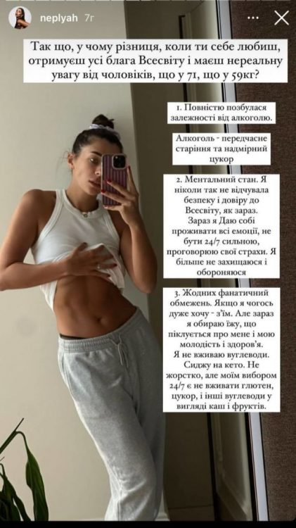 “Повністю позбулася залежності від алкоголю. Алкоголь – передчасне старіння та надмірний цукор. Ментальний стан. Я ніколи так не відчувала безпеку і довіру до Всесвіту, як зараз. Зараз я даю собі прожити всі емоції, не бути 24/7 сильною, проговорюю свої страхи. Я більше не захищаюся і не обороняюся”, – відверто повідомила модель.