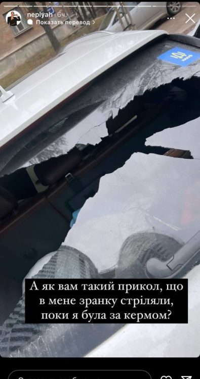 Анна Неплях розповіла, що зранку в її автівку стріляли, коли вона їхала за кермом. Куля влучила в заднє скло та розбила його. На щастя, з дівчиною все гаразд. Анна Неплях отримала лише невеликий шок, адже дуже злякалась.