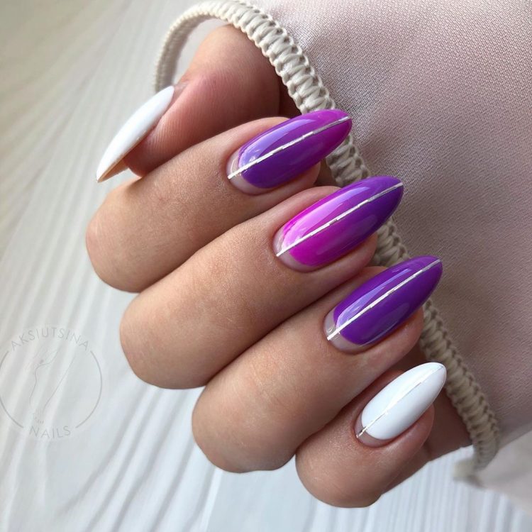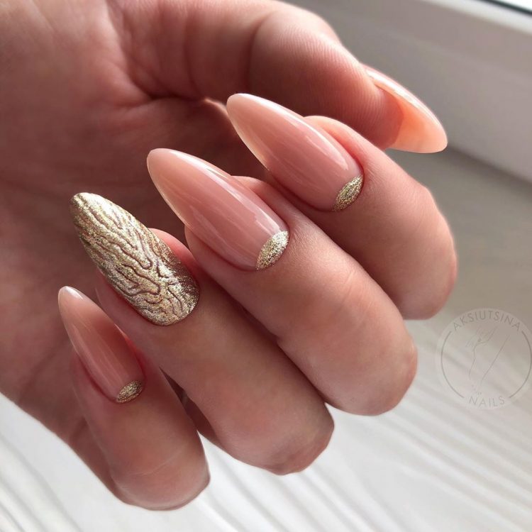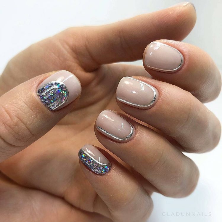 Блискучий металевий ефект лунок на матових чи глянсових пластинах – новинка сезону. Такий манікюр буде найбільш затребуваним цього року. Цікаво виглядає такий манікюр, коли виконують металевий ефект на лунках у вигляді трикутника.