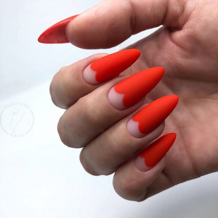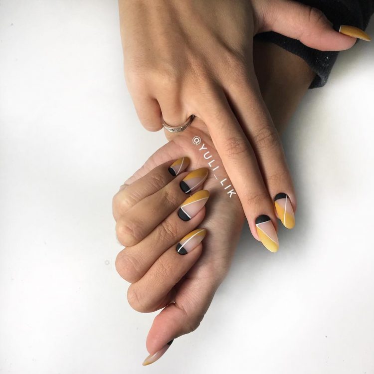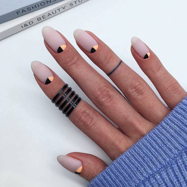 Трикутні лунки, виділені контрастним кольором, виглядають досить цікаво та незвично. Особливо ефектно виглядає матовий варіант місячного манікюру, декорований блискітками у вигляді витягнутого трикутника.
