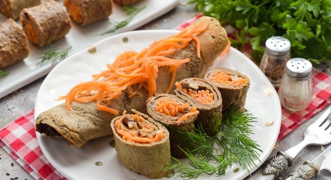 До грибів з цибулею додаємо моркву по-корейськи та перемішуємо. Потім начинку викладаємо на печінкові млинці. Загортаємо їх в рулетики й ріжемо на шматочки. Смачного!
