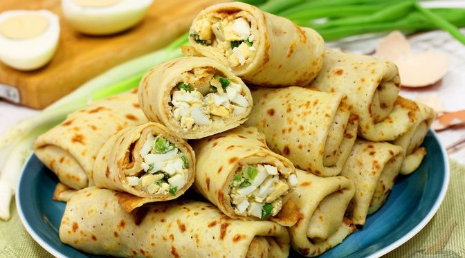 З готового тіста смажимо млинці до апетитної скоринки та охолоджуємо їх. Тим часом приготуємо начинку. Відварені яйця очищуємо. Нарізаємо їх дрібними кубиками або натираємо на тертці. Потім нарізаємо зелену цибулю. З’єднуємо інгредієнти.