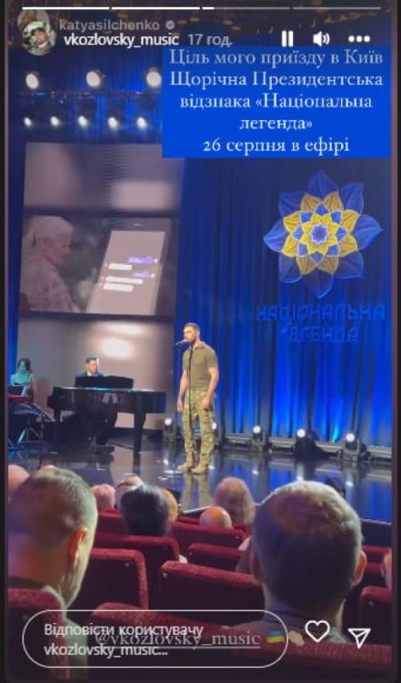 До Дня Незалежності України артист виступив на концерті “Національна легенда”, де вручають однойменну президентську відзнаку. Чоловік додав, що зовсім скоро його виступ покажуть в ефірі. В День Незалежності України Віталій Козловський показав себе на сцені. Він позував у військовій формі та співав.