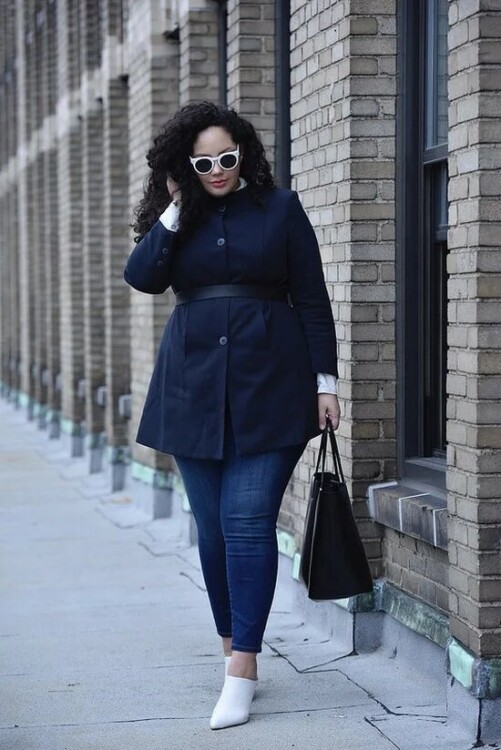 Якщо говорити про верхній одяг, то тут будь-яка модниця з пишними формами зможе задовільнити власні побажання. В топі подовжене пальто, яке ідеально виглядає як з сукнями, так і з джинсами. Взуття до нього можете вибирати те, в якому зручно, будь то кросівки або витончені ботильйони на підборах.