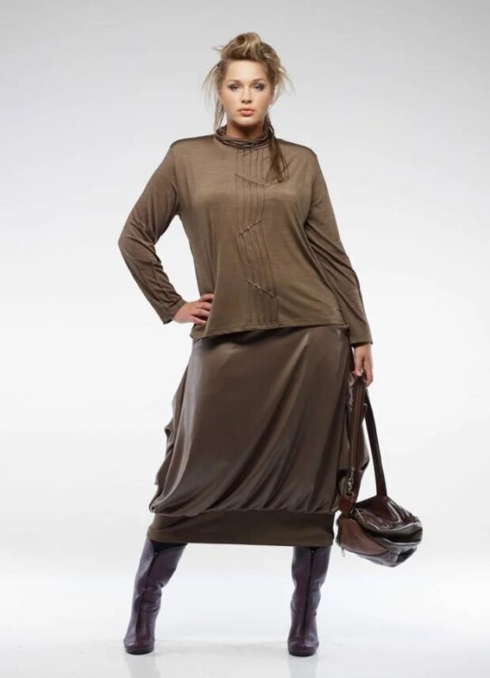 Ідеальний варіант для повних жінок, оскільки монохромний аутфіт створює візуально вертикаль, що робить фігуру стрункішою. Якщо в сеті присутня в’язана річ, в’язка в ній повинна бути дрібною.