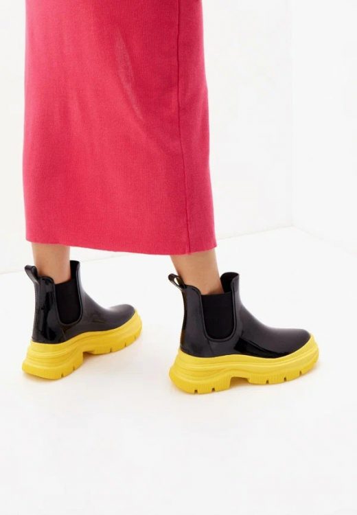 Яка ж осінь та зима без дощів, сльоти та бруду? Гумові чоботи стали постійним супутником наших повсякденних аутфітів. Окремі бренди (Chanel, Aigle) підготували цілі колекції гумових чобіт, інші (Dior, Ganni) представили шкіряні черевики з невеликою гумовою аплікацією в області носка та п’яти. Актуальними восени 2022 будуть чоботи та черевики з об’ємною гумовою підошвою. Гумові чоботи можна поєднувати із щільними колготками та міні, або з джинсами. У частині верхнього одягу обмежень теж немає: такі моделі добре комплектуються з плащем, косухою, пальто та іншим верхнім одягом.