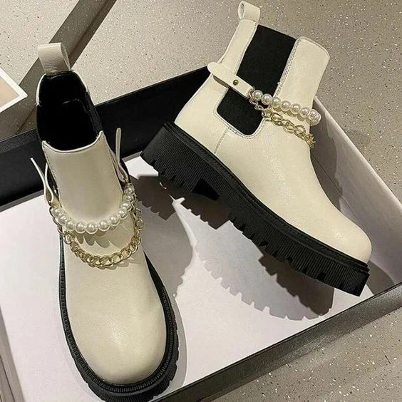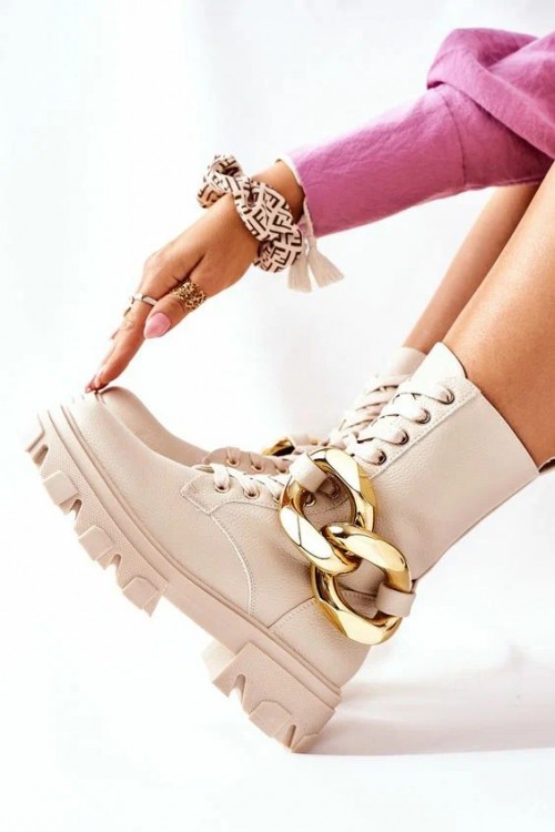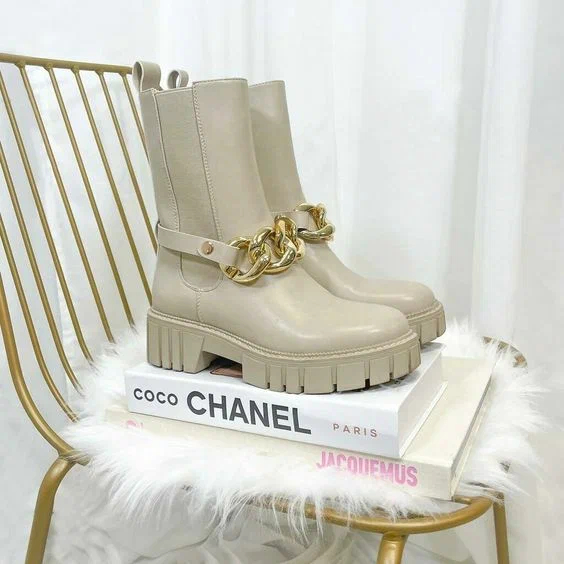 Стильна модель – це розкішні черевики зі світлої шкіри на тракторній підошві, прикрашені масивним золотим ланцюгом, що знаходиться на щиколотці.
