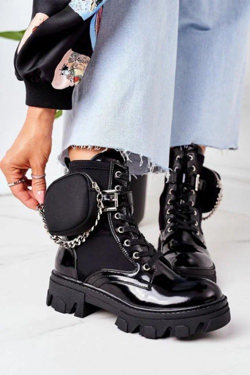 Трендові черевики з лакованими вставками та маленьким кошельком, кутюр’є також вирішили прикрасити лаконічними ланцюгами невеликого розміру. Ідеальним вибором буде взуття із золотою або срібною фурнітурою.
