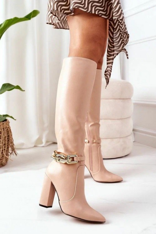 Гуру моди звертають нашу увагу на елегантні чоботи з гострим носом на високому квадратному підборі, які також привертають до себе увагу за рахунок ланцюгів в області щиколотки.