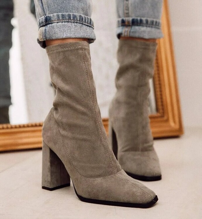 Замшеві ботильйони панчохи з квадратним носком на високому стійкому каблуці – жіночна модель зимового взуття, за допомогою якої можна створювати неймовірно красиві та елегантні аутфіти навіть в холодну пору року.