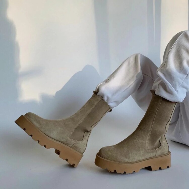 Замшеві черевики челсі на тракторній підошві в бежевій палітрі ідеально підійдуть для білих зимових луків.