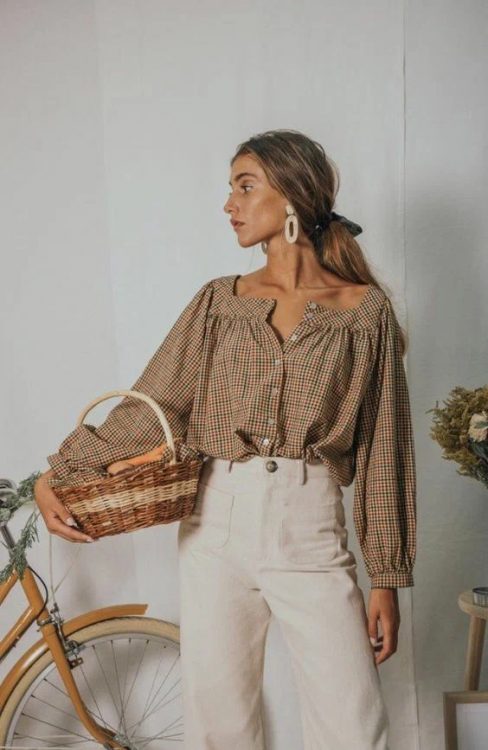 Принтовані блузки в дрібну різнокольорову клітинку, з акцентними рукавами і квадратним вирізом в зоні декольте – дивовижний варіант, який чудово урізноманітнить нудні повсякденні образи. Щоб не «заглушити» яскравий принт блузки, цю річ краще поєднувати з однотонними світлими брюками або джинсами зі світлого деніму.