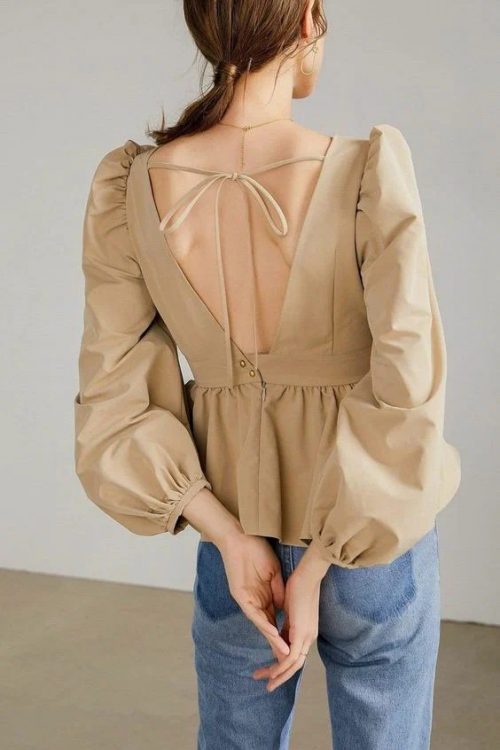 Наступна модель – це блузка з відкритою спиною та жіночними об’ємними рукавами. Гуру моди акцентують нашу увагу на однотонних моделях, виготовлених з натуральної тканини. Базові, нейтральні відтінки допоможуть поєднувати цю річ із будь-яким стилістичним низом.