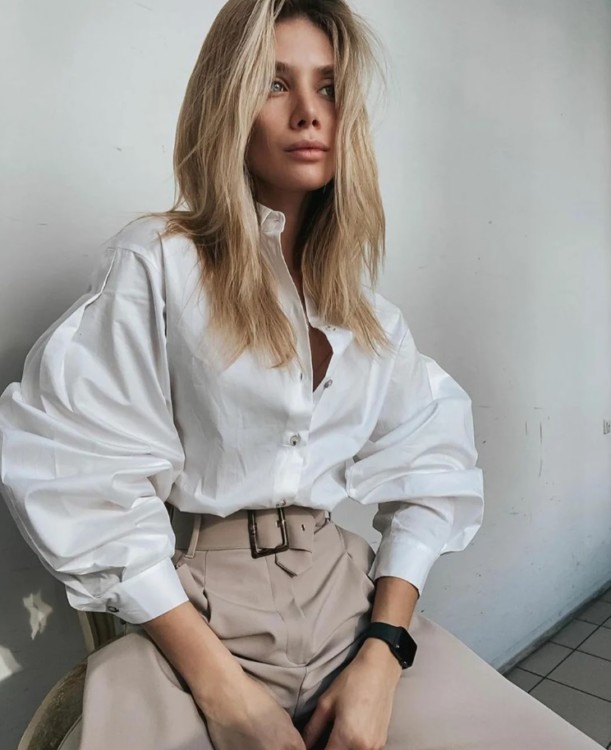 Чарівну білу блузу з трендовими рукавами «буфами» можна поєднувати в одному аутфіті з класичними брюками базового відтінку.