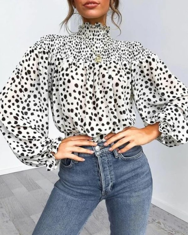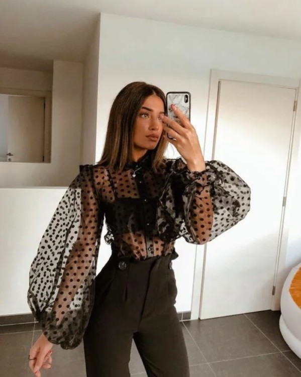 Чарівні блузи, виконані з легкої і повітряної тканини в дрібний горошок, виглядають жіночно, романтично і елегантно на стрункій жіночій фігурі. Дану модель блуз можна поєднувати в одному тандемі з базовими класичними чорними брюками з високою посадкою.