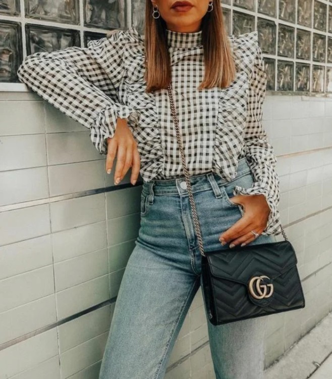 Картата блузка з грайливими рюшами і високою горловиною підійде для строгого або романтичного аутфіту.