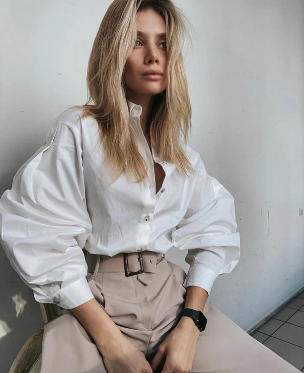 Біла блузка з ефектними рукавами «буфами» – актуальний тренд, який можна назвати сучасною базою. Ультрамодну блузку можна використовувати в багатошарових, а також мінімалістичних аутфітах. Перед нами наочний приклад того, як гармонійно біла базова блуза перегукується з класичними штанами пісочного відтінку.