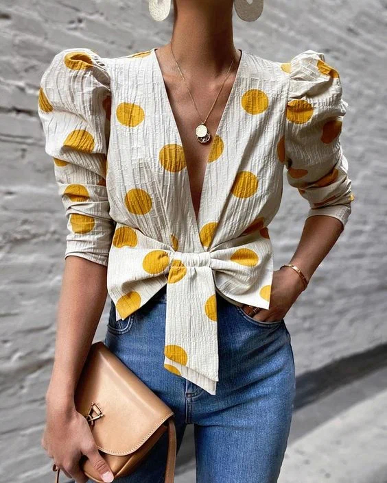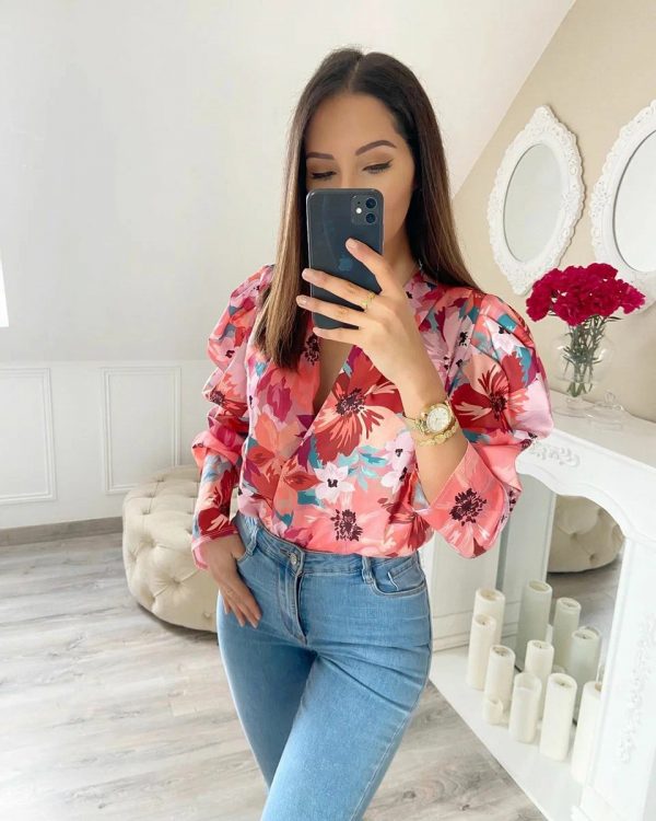 Наступна блуза виглядає максимально ніжно та елегантно. Ви тільки подивіться на ці об’ємні рукави, чарівний глибокий виріз, об’ємний бант на талії і яскравий принт. Ідеальна до дрібниць модель блузки в стилі 70-х, з якою абсолютно будь-яка річ виглядатиме святково та жіночно.