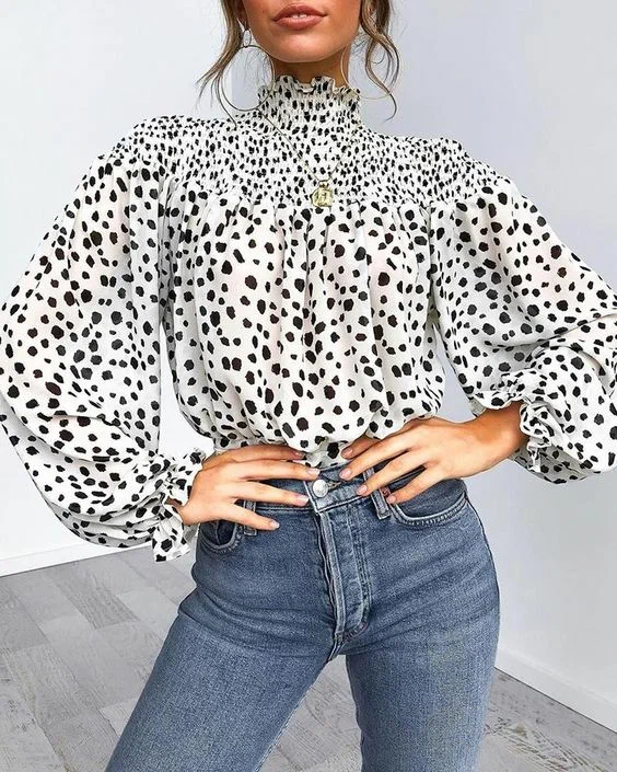 Граціозна та грайлива модель блузки з високим коміром у колоритний леопардовий принт – справжня знахідка сучасних модниць. Якщо у вашому гардеробі є подібна модель блузи, значить, ви точно розумієтеся на сучасній моді.
