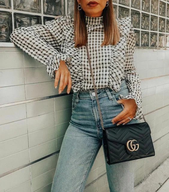 Блуза, від якої так і віє жіночністю, прикрашена об’ємними рюшами на грудях та рукавах. Особливої родзинки, звичайно, додає принт в клітинку. Ця модель ідеально підійде красуням з невеликим розміром грудей.
