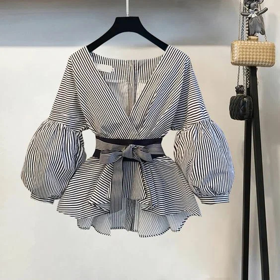Особливу увагу кутюр’є приділили блузам на запах у стильну смужку. Звичайно ж, акцентні рукави та приталений силует тут відіграють важливу роль. Вертикальна смужка допомагає сучасним леді виглядати струнко та витончено.