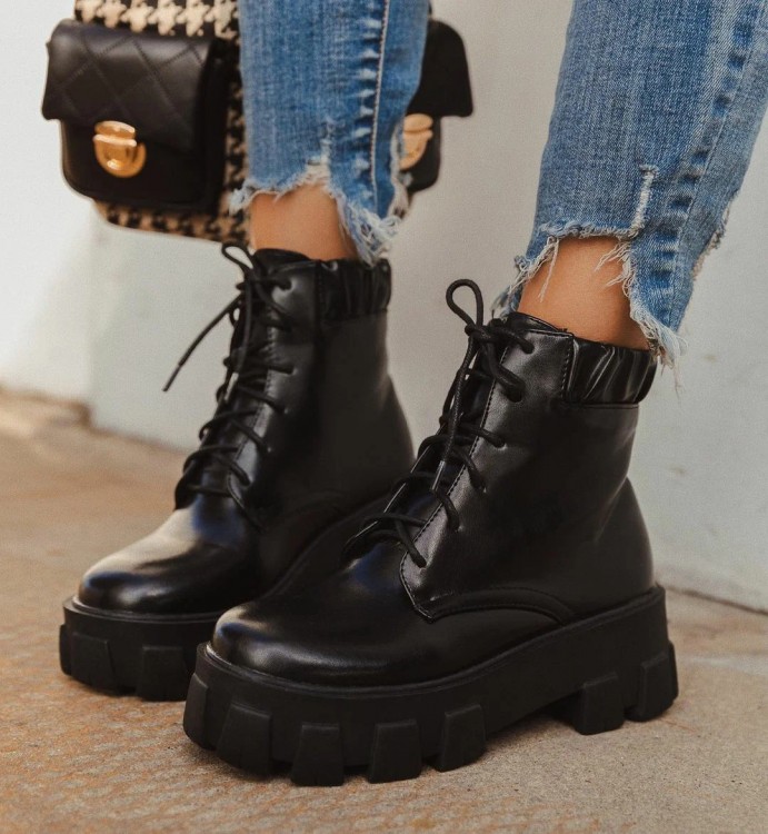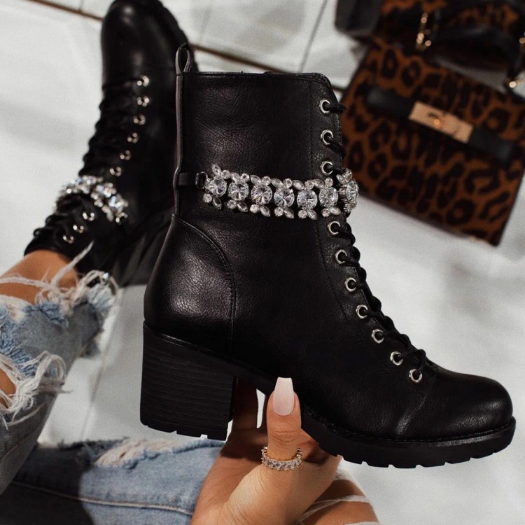 На прилавках магазинів також можна знайти черевики на масивних стійких підборах, прикрашені стразами. Стилісти звертають нашу з вами увагу на моделі на шнурівці, вони не мають собі рівних у 2022 році.