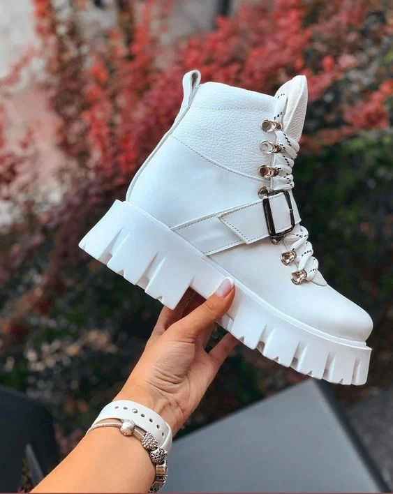 Додати своїм аутфітам максимальної трендовості вам вдасться за допомогою білих черевиків на тракторній підошві та зі шнурівкою по всій довжині.