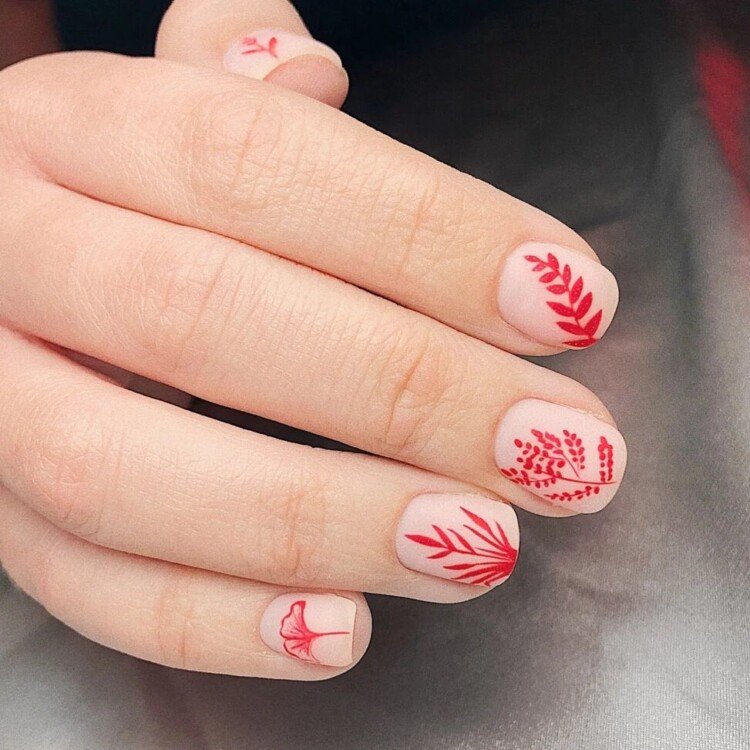 Подивіться, як мило і ненав’язливо виглядають червоні гілочки на нейтральних нюдових нігтях. Так, такий дизайн теж можна віднести до червоного, а чому ні?