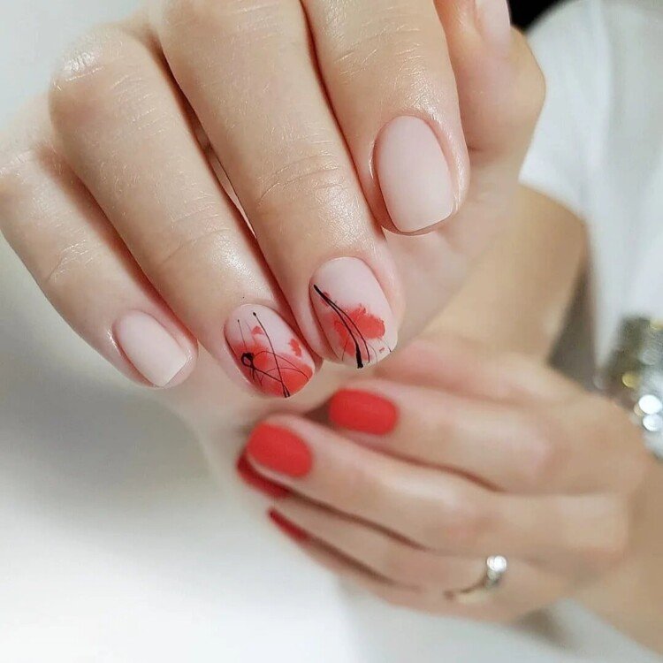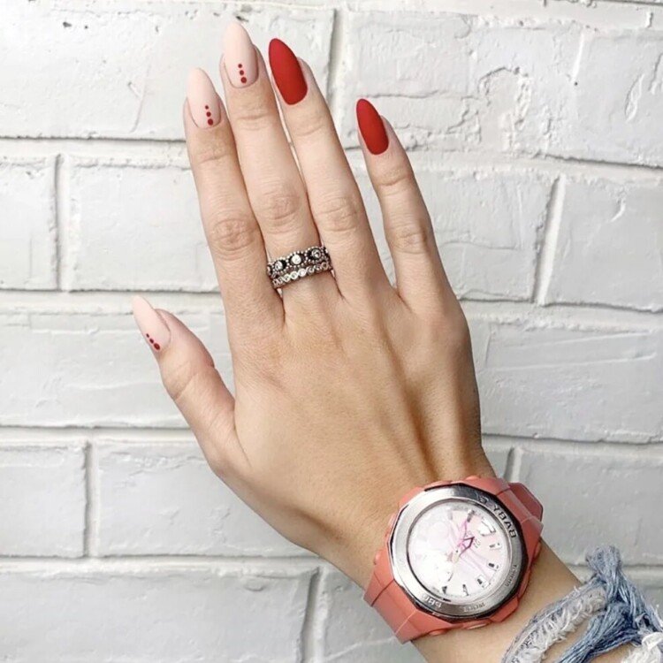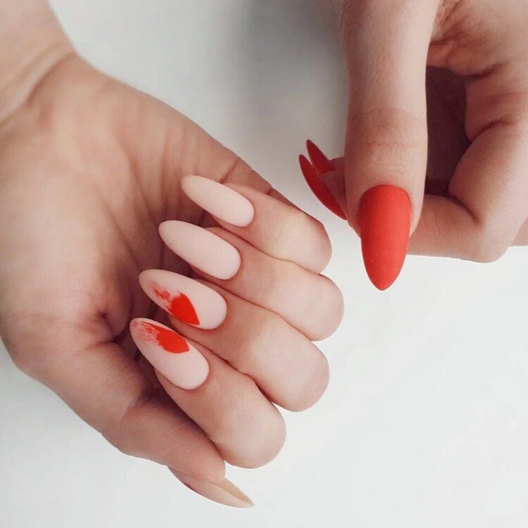 Даний дизайн прекрасно підійде для жінок, які працюють в офісі, а ідеї з матовим нюдовим покриттям в поєднанні з червоним кольором знадобляться вам, як універсальний варіант на кожен день.