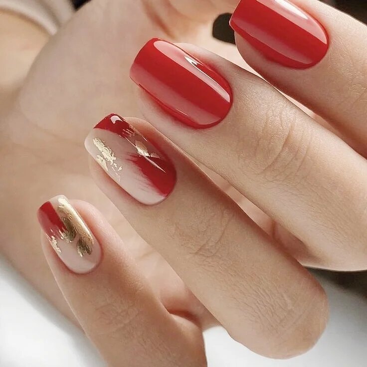 Фольга, блискітки і ніжний нюд. Надати нігтям більш доглянутий і спокійного вигляду допоможе нюд, адже жоден інший відтінок не зробить червоний колір в манікюрі таким стриманим і елегантним.