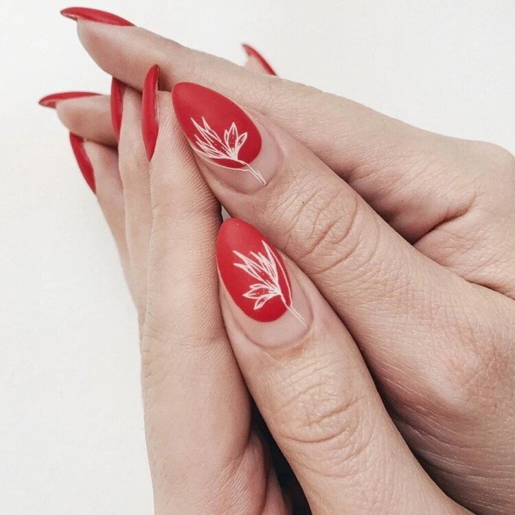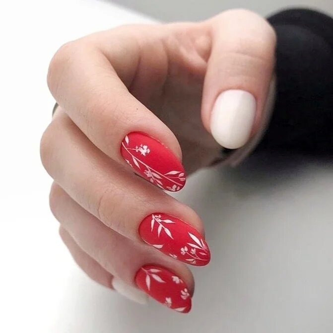 Флористика. Лаконічний червоний манікюр чудово розбавляється флористичними мотивами, візерунок буде актуальним навіть взимку. Якщо в подібному рішенні будуть присутні тільки білі і червоні відтінки, то ваш манікюр автоматично потрапляє в усі свіжі тренди і тенденції. З одного боку – краса і яскравість, з іншого – простота і стриманість.