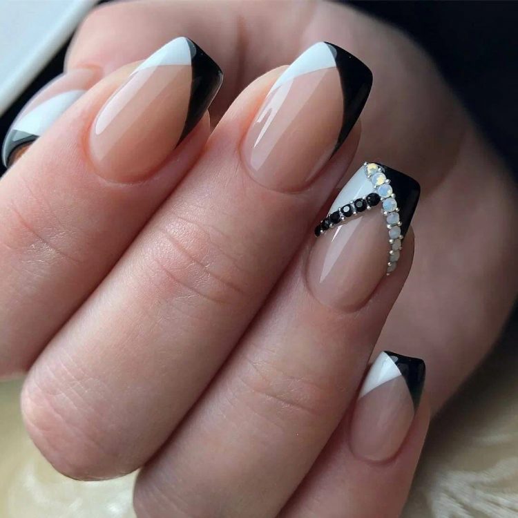 Французький манікюр – це класика, але це не означає, що з ним не можна експериментувати. Додайте до традиційного білого кольору контрастний чорний. Таким чином, ви отримаєте універсальний дизайн, який підійде як для роботи в офісі, так і для вечері в ресторані.