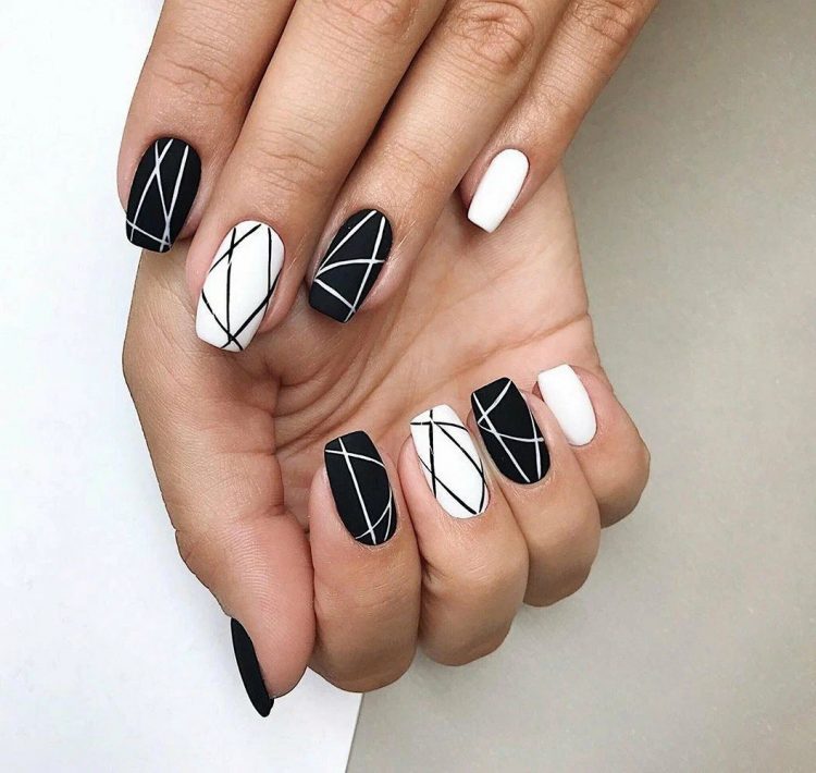 Любите мінімалізм? Тоді витончений геометричний дизайн у чорно-білих тонах – найкраще рішення. В якості малюнка можна використовувати чіткі прямі лінії, крапки або геометричні фігури. Так як чорний і білий кольори сильно контрастують один з одним, на нігтьових пластинах добре будуть проглядатися навіть найдрібніші елементи. Додати оригінальності дизайну можна за допомогою матового топу або техніки negative space.