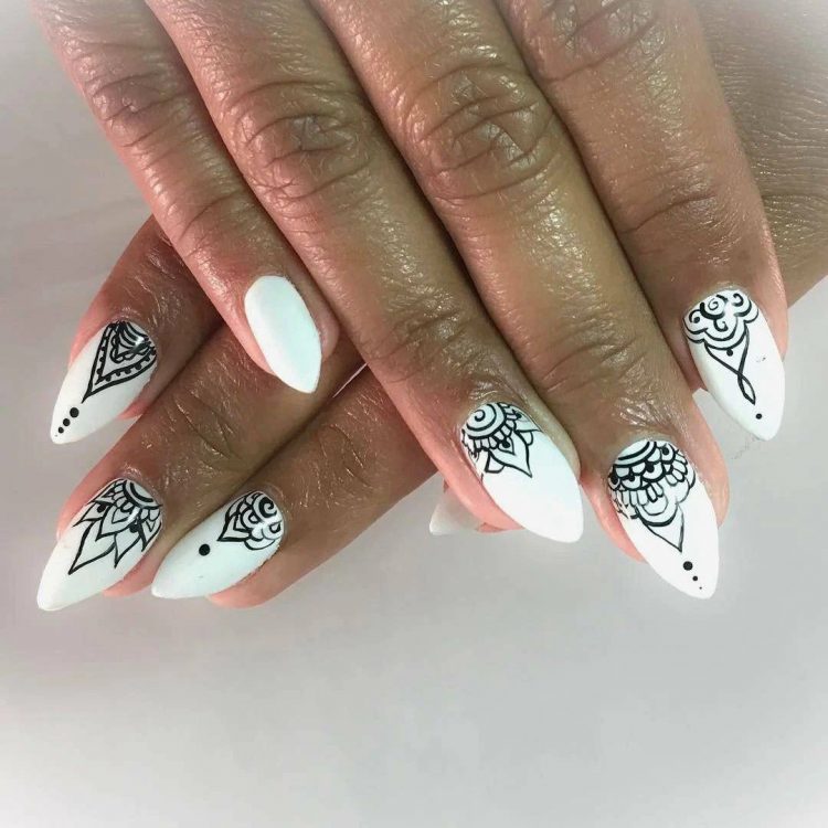 Чорно-біла палітра ідеально підходить для створення етнічних візерунків. Незважаючи на свій мінімалізм, такий дизайн виглядає яскраво та помітно. Необов’язково робити однакові малюнки на всіх нігтях – нейл-арт може вийти одноманітним та нудним. Нехай на кожному нігті красується неповторний дизайн – це цілком відповідає загальній концепції етнічного стилю.