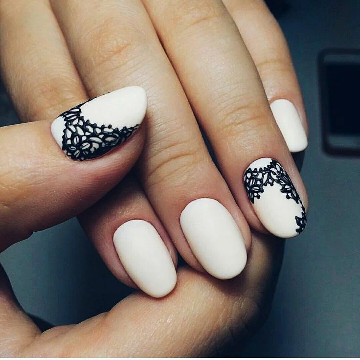 Мереживо на нігтях особливо вдало виглядає саме в контрастних відтінках. Тонкий чорний візерунок чудово проглядається на білому тлі. Можна змінити подекуди кльори і, навпаки, нанести білий візерунок на чорну основу. Для створення мережива можна скористатися тонким манікюрним пензликом або набором для стемпінгу.