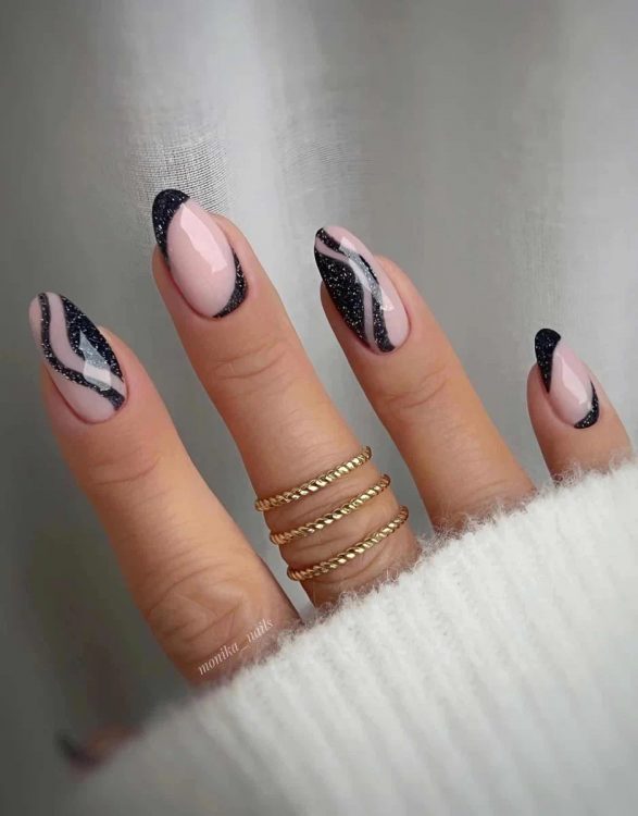 Блискучі чорні хвилі на нігтях – сучасний, але в той же час елегантний дизайн. Цей манікюр неймовірно жіночний та привабливий.