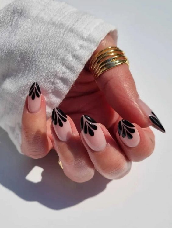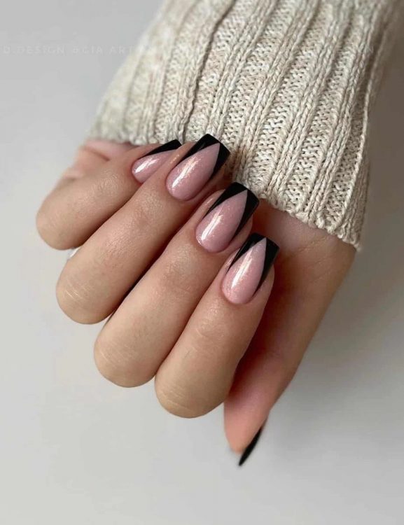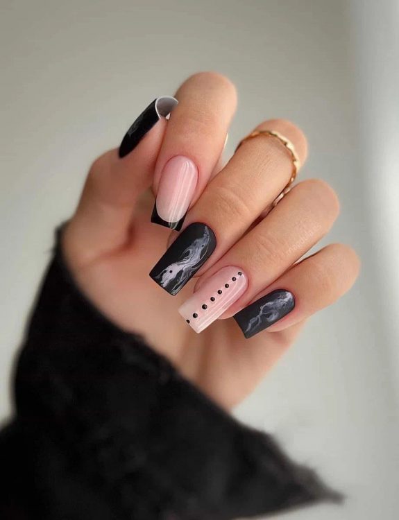 Цей манікюр є ідеальним поєднанням грайливості та елегантності. Світло-рожевий відтінок чудово виглядає з насиченим чорним кольором. Французькі кінчики та малюнок у вигляді точок – приголомшливі акценти, які зовсім не псують класичну естетику цього дизайну нігтів.