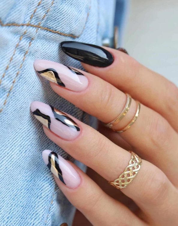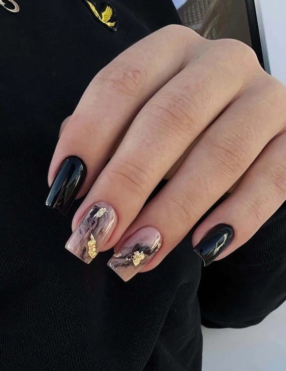Всі шалеіють від елегантних мармурових візерунків, а додавання золотої поталі – ще один вишуканий штрих. Нюдовий лак розбавляє чорний колір та освіжає образ.