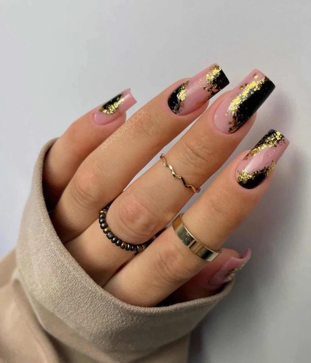 Ніжно-рожевий нюд надає жіночності будь-якому манікюру. Він чудово виглядає у поєднанні з чорним лаком. Золоті блискітки загадково мерехтять і привертають до себе увагу.