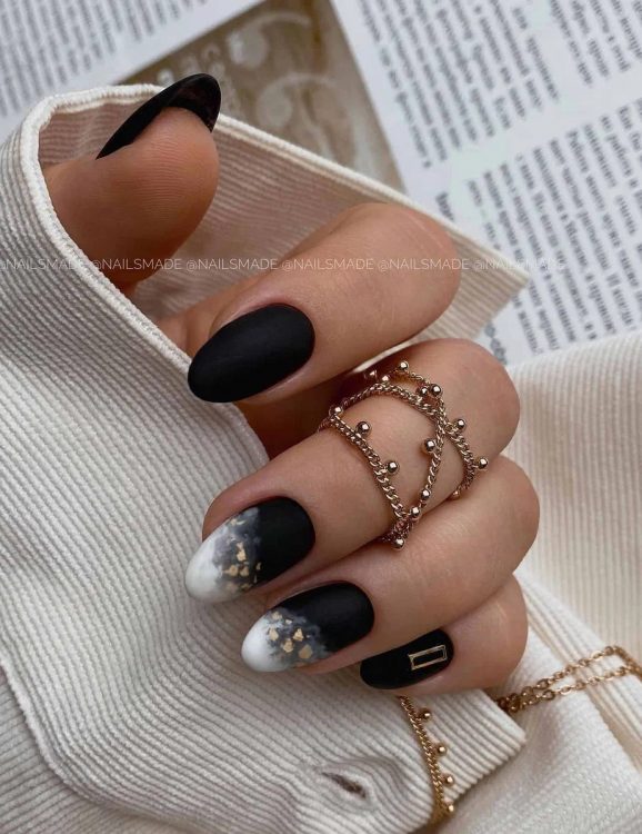 Спробуйте повторити цей чудовий чорно-білий манікюр у техніці омбре з декором у вигляді золотих пластівців. Цей класичний та розкішний дизайн ідеально підійде для урочистого випадку.