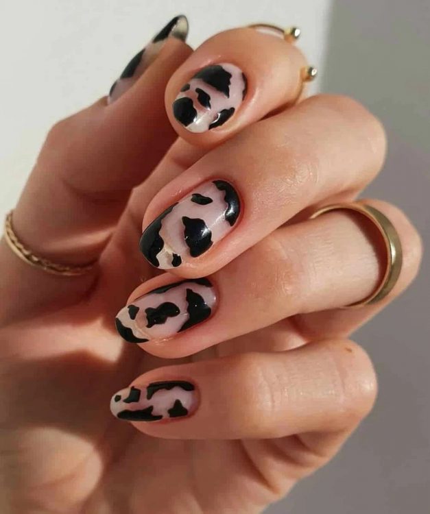 Коров’ячий принт не втрачає популярності протягом останніх кількох років, ось чому це чудовий вибір для тих, хто хоче слідувати трендам. Візерунок досить строкатий сам по собі, тому в якості основи можна використовувати прозоре покриття.