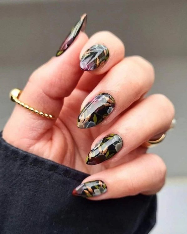 Темні тони кольорів та листя ідеально поєднуються з чорним лаком для нігтів, а золоті акценти додають витонченості.