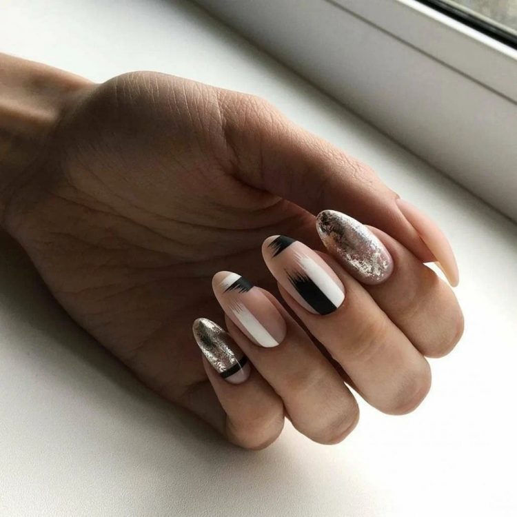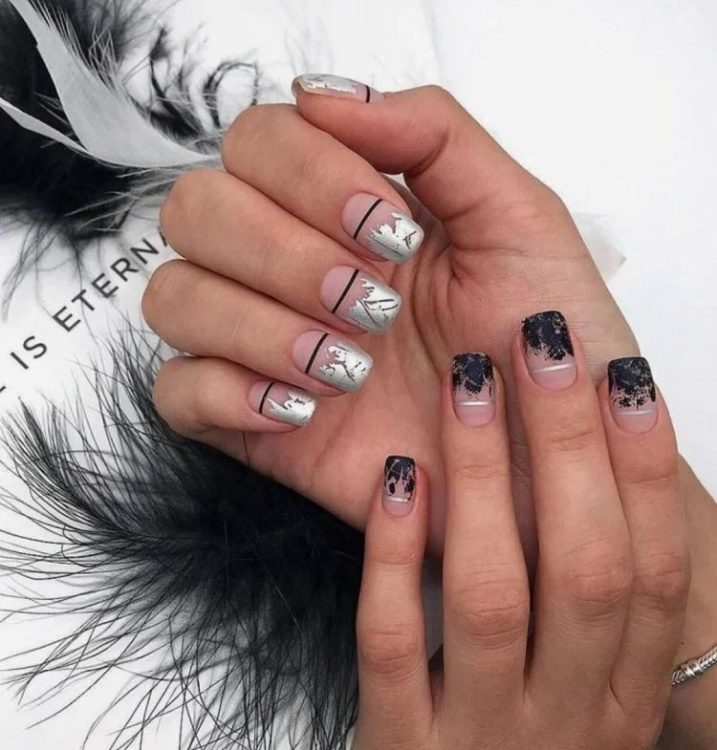 Діловий манікюр теж може бути яскравим та ефектним. Тому в ньому допустиме використання фольги. При цьому вона може бути застосована і у френчі, і в імітації мармуру, і у випадку геометричного дизайну.