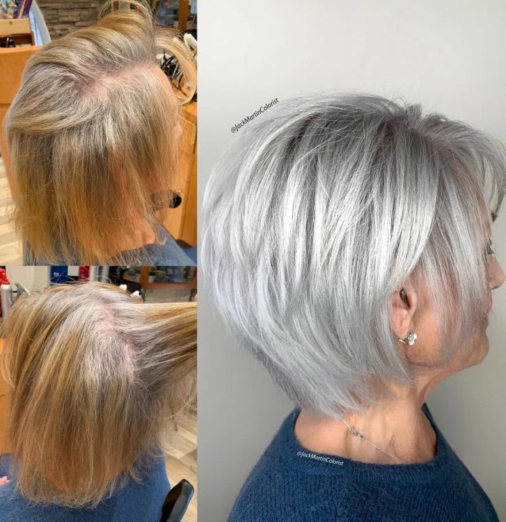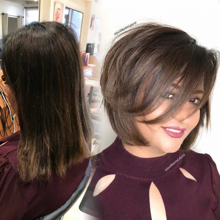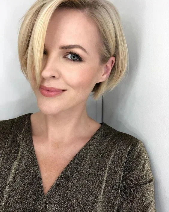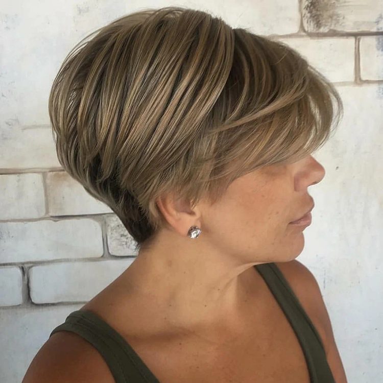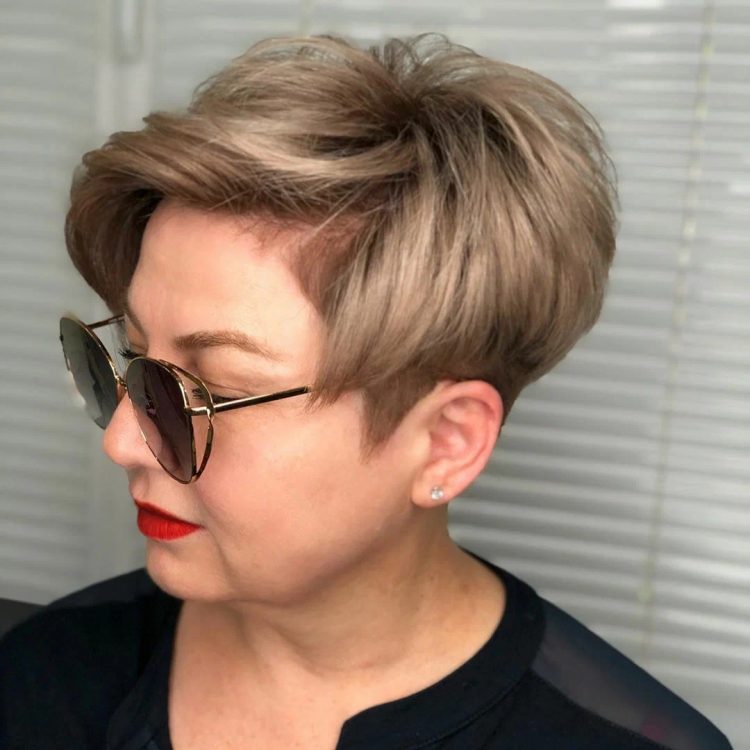 Укорочена варіація стрижки боб виглядає ефектно на старших жінках. Гарно оформлена об’ємна потилиця та косий градуйований чубчик — ідеальний тандем для спекотної літньої погоди.