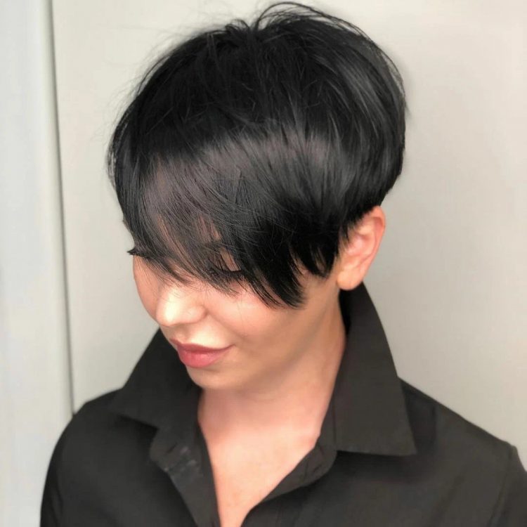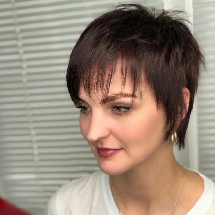 Наступна варіація піксі вже має більш подовжені текстуровані пасма на маківці, за рахунок яких волосся здається в кілька разів густішим. З цією довжиною ідеально поєднується прямий градуйований чубчик і “загострені” скроні.